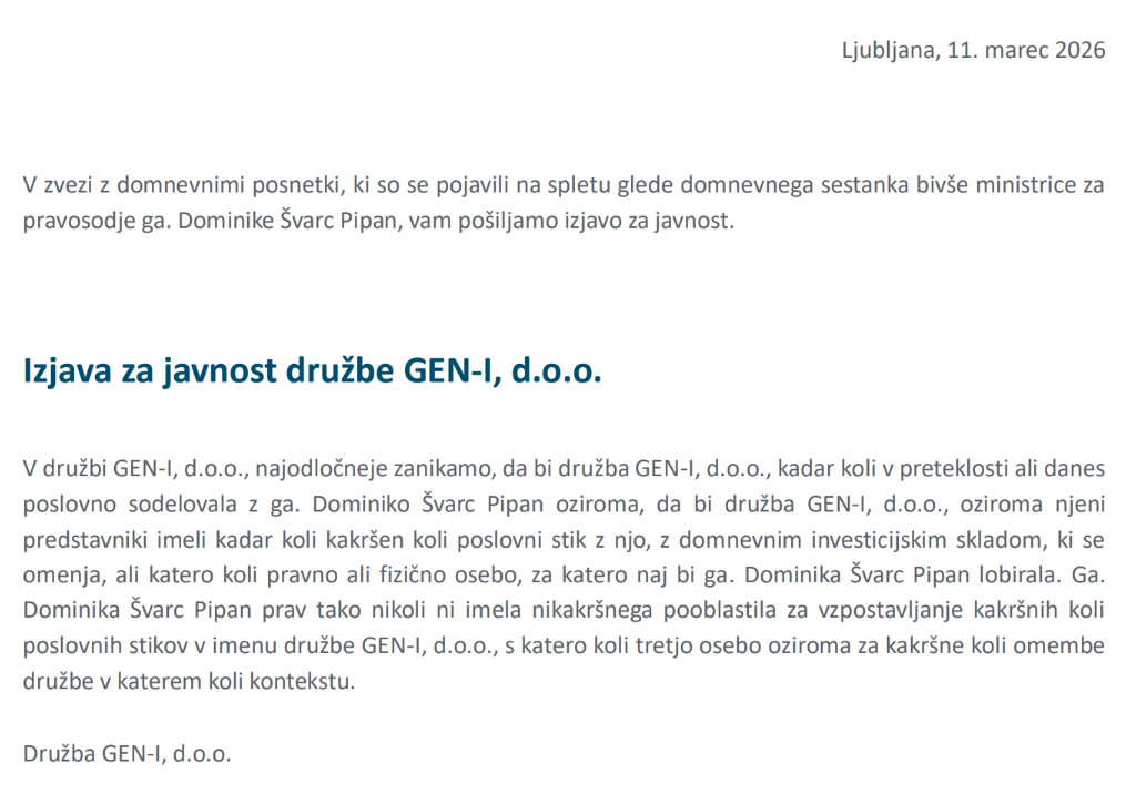 Iz Gen-I so popoldne sporočili, da s Švarc Pipan niso poslovno sodelovali, prav tako ne z omenjenim domnevnim investicijskim skladom ali katerokoli pravno ali fizično osebo, za katero bi nekdanja ministrica lobirala. Švarc Pipan prav tako ni imela nikakršnega pooblastila za vzpostavljanje kakršnih kolih poslovnih stikov v imenu družbe, so navedli v Gen-I.