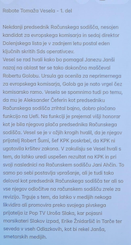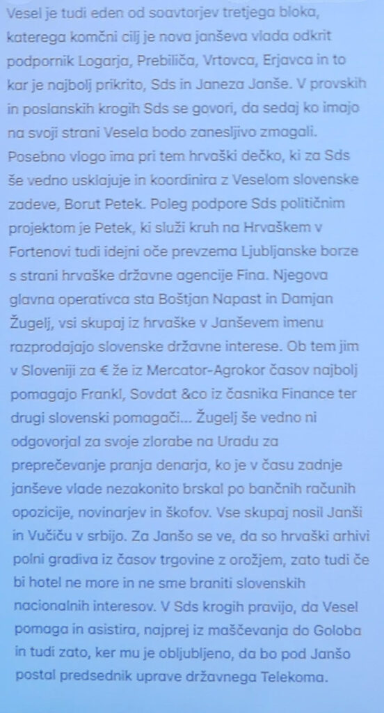 Sicer anonimni zapis vsaj po branju po diagonali pade v kontradikcijo, saj naj bil Vesel od stranke Gibanje Svoboda prestopil k Janši, po drugi strani pa naj bi bil “eden od soavtorjev tretjega bloka katerega končni cilj naj bil bil nova Janševa vlada. Vesela obtožuje, da naj bi bil “odkrit podpornik, Logarja, Prebiliča, Vrtovca, Erjavca in to kar je najbolj prikrito SDS in Janez Janše” . Očitno gre v ozadju za prikrit politični obračun, ki pa je zanimiv, saj nakazuje “premike in okope” v slovenski politiki pred velikim obračunom spomladanskimi parlamentarnimi volitvami. Zapis objavljamo spodaj v integralu.