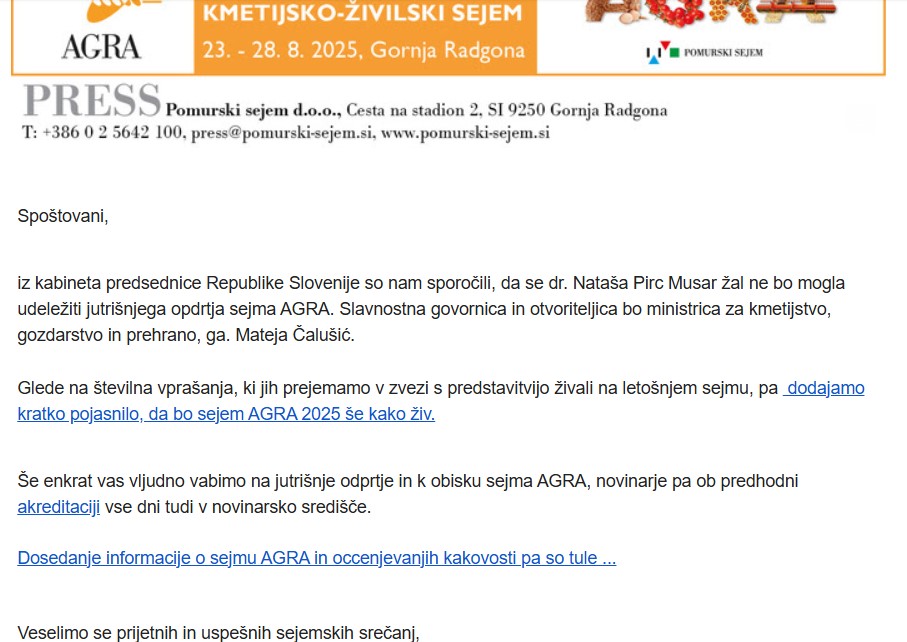 Na razstavišču Pomurskega sejma v Gornji Radgoni se danes začenja 63. mednarodni kmetijsko-živilski sejem Agra. Čeprav je bil dogodek napovedan pod častnim pokroviteljstvom predsednice republike Nataše Pirc Musar, ta sejma ne bo otvorila. To je sicer izredno nenavadno. Iz organizacijskega odbora so sporočili, da bo slavnostna govornica kmetijska ministrica Mateja Čalušić, neuradno pa se špekulira, da naj bi bil razlog za odsotnost predsednice afera zaradi njenega nedavnega poleta s helikopterjem iz Portoroža v Beltince. Organizatorji so ob tem v sporočilu za medije zagotovili, da sejem poteka nemoteno in v polnem obsegu, saj se bo v šestih dneh predstavilo 1710 razstavljavcev iz 35 držav, partnerica letošnjega sejma pa je Srbija.