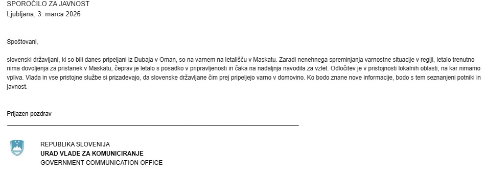 Letalo, ki naj bi iz Omana v domovino prepeljalo prvo skupino slovenskih državljanov, ki so zaradi vojne obtičali na Bližnjem vzhodu, je po poročanju portala N1 vendarle dobilo dovoljenje za pristanek v Maskatu. V Ljubljani naj bi pristalo danes, na spletni strani letališča ljubljanskega letališča naj bi nove informacije o letu objavili ob 10. uri.