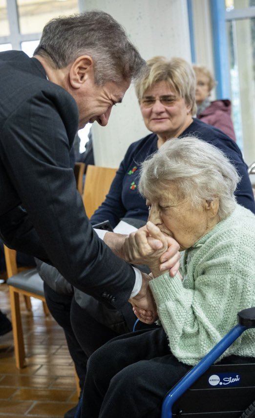 “Socialna država in skrb za starejše je ena od glavnih tem, ki jo naslavljamo cel mandat in tako želimo nadaljevati. Z dolgotrajno oskrbo kažemo, da nam ni vseeno in da želimo vsakemu starostniku omogočiti dostojno starost,” so na vladnem profilu na družbenem omrežju X zapisali ob včerajšnjem obisku predsednika vlade Roberta Goloba v oblano – kraški regiji, ki ga je začel v domu starejših v Izoli. Na družbenih omrežjih je precej pozornosti vzela fotografija, ko starejša oskrbovanka poljublja roko Robertu Golobu, hvaležna za manjšo januarsko položnico.