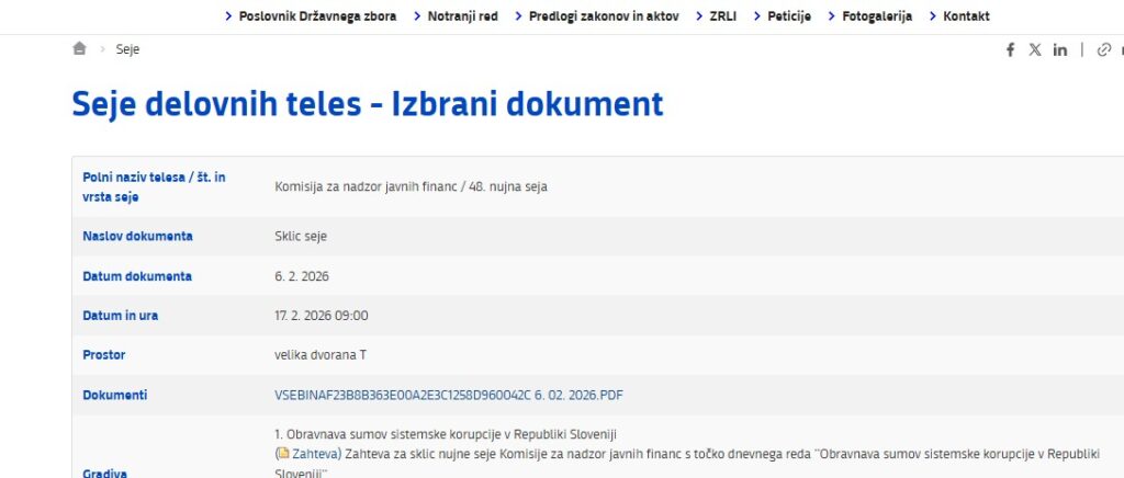 Komisija za nadzor javnih financ, ki se bo sestala danes ima samo eno točko dnevnega reda: “Obravnava sumov sistemske korupcije v Republiki Sloveniji” Sklic izredne seje komisije za nadzor javnih financ je zahteval poslanec in predsednik Demokratov Anže Logar.