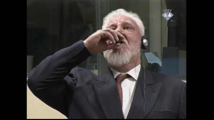 Prizor je močno spominjal na dogodek na Mednarodnem sodišču za vojne zločine na območju nekdanje Jugoslavije, ko se je ob izreku dokončne sodbe šestim Hrvatom iz BiH zgodila drama. Slobodan Praljak, ki ga je sodišče obsodilo na 20 let zapora, je med izrekom zavpil, da ni vojni zločinec in popil strup, pozneje pa v bolnišnici umrl.
