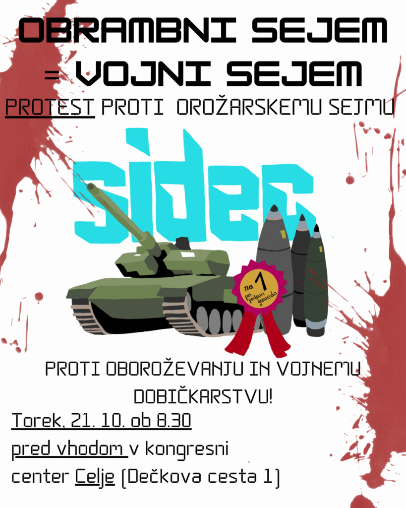 V torek, 21. oktobra 2025, ob 9:00, bomo pred glavnim vhodom Kongresnega centra Celje (Dečkova cesta 1) izvedli koordiniramo simbolično akcijo, ki bo nazorno pokazala trgovcem s smrtjo, politikom in medijem pravo ceno in resnične žrtve vojnega hujskaštva. Poleg protesta in razstave portretov žrtev vojne bo hkrati potekala tudi “flash-mob” akcija pred vhodom v razstavišče. Skupaj z drugimi mirovnimi in civilno-družbenimi organizacijami bomo ob začetku mednarodnega obrambnega sejma SIDEC izrazili ogorčeno nasprotovanje stihijskemu oboroževanju Slovenije ter opozorili na prisotnost tujih podjetij, vpletenih v izraelsko represijo nad palestinskim prebivalstvom, na sejmu.