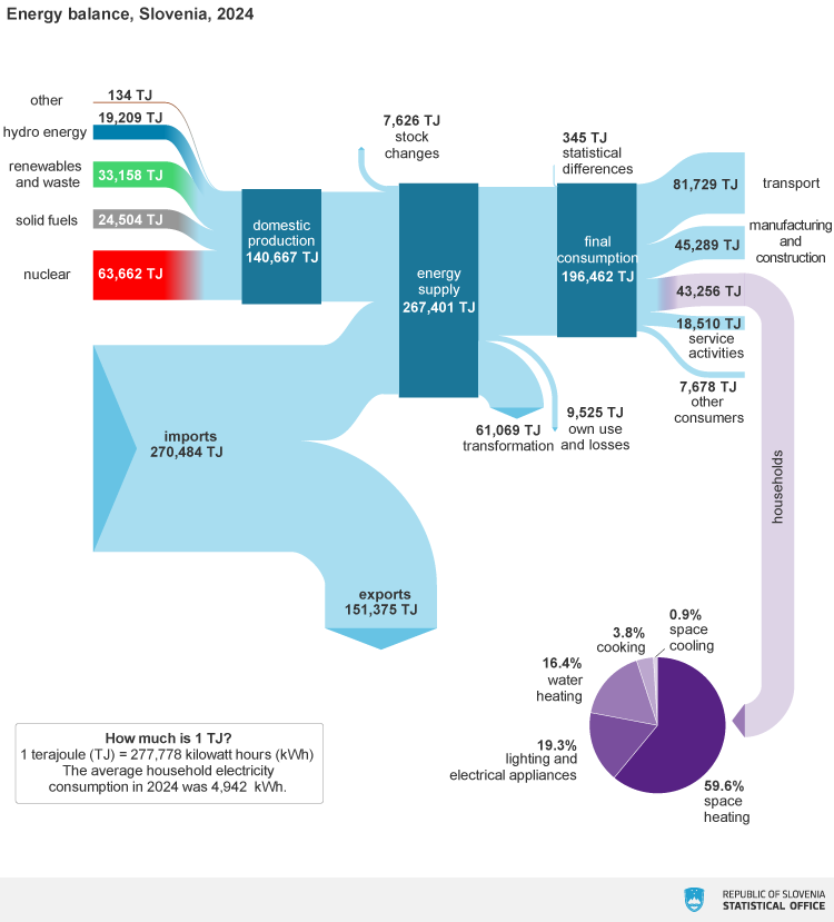 Podatki SURS kažejo, da se Slovenija sooča z naraščajočo rabo energije, zlasti v prometu, hkrati pa postopno zmanjšuje uvozno odvisnost. Jedrska energija in obnovljivi viri ostajajo ključna stebra domače proizvodnje, a prehod v bolj trajnostni energetski sistem bo zahteval nadaljnje ukrepe predvsem na področju prometa, energetske učinkovitosti in razogljičenja.